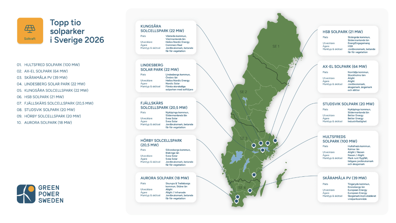 Till detta kommer ytterligare en park på listan: För European Energys Skåramåla Solpark, nummer 3 på listan, ansvarar Alstra Energy för drift och underhåll genom ett långsiktigt O&M-avtal. Totalt är Alstra Energy därmed involverade i hälften av landets största solcellsparker.